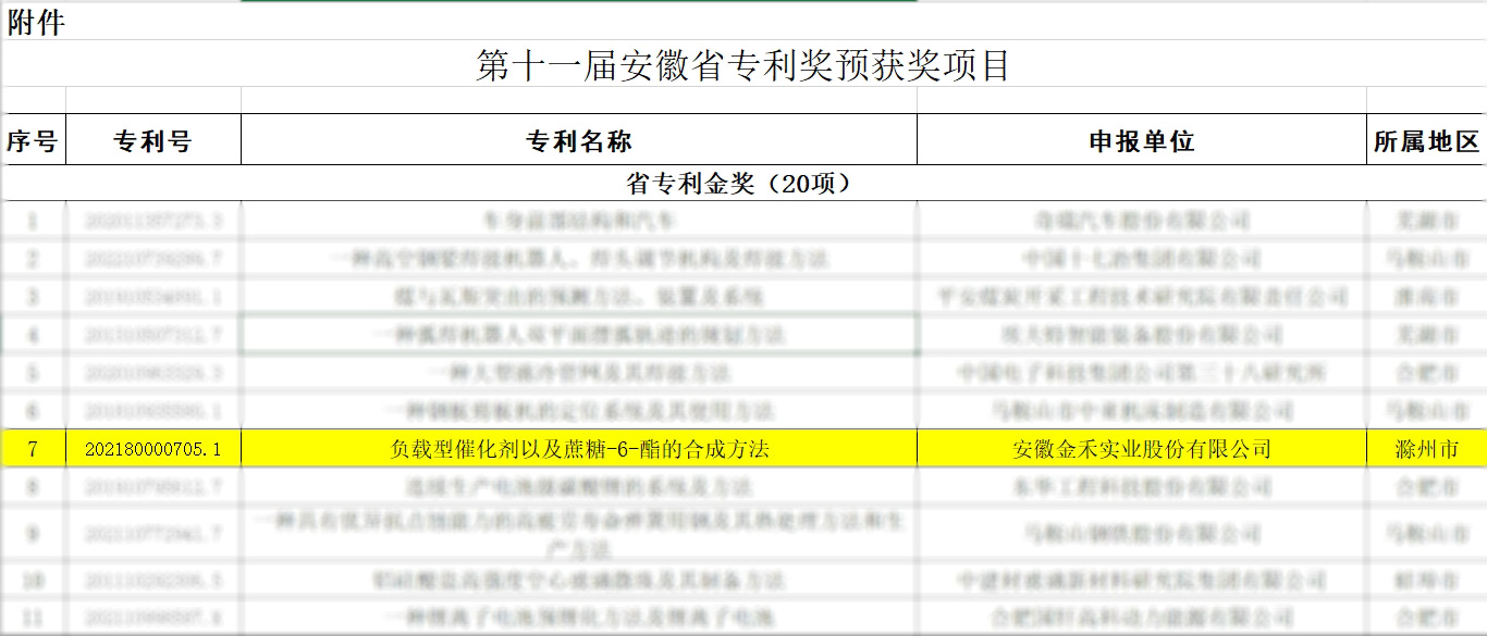 9月21日,在2024世界制造业大会知识产权保护和运用对接会上,安徽省市场监督管理局(安徽省知识产权局)发布了第十一届安徽省专利奖获奖名单。公司申报的“负载型催化剂以及蔗糖-6-酯的合成方法(202180000705.1)”荣获本届专利金奖,这是公司继获第十届安徽省专利金奖后,再获金奖。