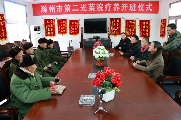 1月30日上午,在滁州市(长山)第二光荣院,慰问小组怀着十分崇敬之心,探望生活在这里的为革命事业致伤致残的孤寡退伍老兵,和他们握手言欢,聆听他们革命传统故事,为尊敬的老兵拜年,祝老兵身体健康长寿,并向光荣院赠送了鸡蛋、食用油、大米等慰问品和慰问金。