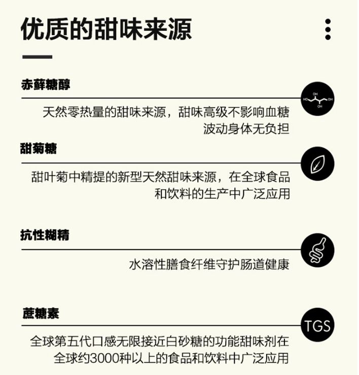 通过200多次测试调整配方比例,获得了和蔗糖相近口感的同时保证了健康与营养,在保证口感不变的情况下将热量、糖分、脂肪全部降为了零,这是当前减糖产品最核心的痛点之一,也是壁垒所在。