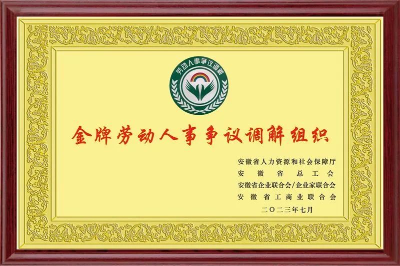 金牌引领,和谐共进 | 公司荣获“安徽省金牌劳动人事争议调解组织”称号!